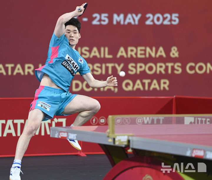[도하(카타르)=뉴시스] 사진공동취재단 = 장우진이 20일 카타르 도하 카타르대학교 스포츠 컴플렉스에서 열린 2025 국제탁구연맹(ITTF) 세계선수권대회 남자단식 64강 이란 베냐민 파라지와 경기를 펼치고 있다. 2025.05.20. [email protected]