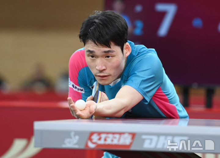 [도하(카타르)=뉴시스] 사진공동취재단 = 장우진이 20일 카타르 도하 카타르대학교 스포츠 컴플렉스에서 열린 2025 국제탁구연맹(ITTF) 세계선수권대회 남자단식 64강 이란 베냐민 파라지와 경기를 펼치고 있다. 2025.05.20. [email protected]