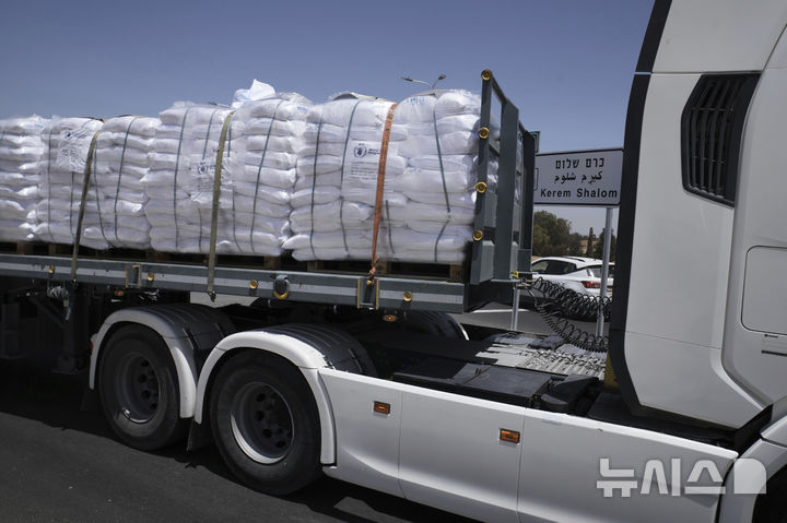 [케렘 샬롬=AP/뉴시스] 20일(현지 시간) 가자지구에 대한 인도적 지원 물품을 실은 트럭이 이스라엘 남부-가자지구 접경인 케렘 샬롬 검문소를 향해 이동하고 있다. 2025.05.21.