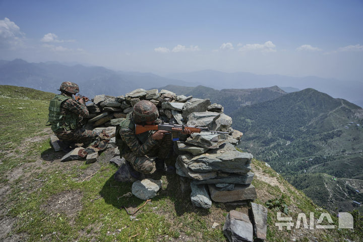 [푼치=AP/뉴시스] 20일(현지 시간) 인도-파키스탄 접경 실질통제선(LoC) 인근에서 언론 참관 행사가 열린 가운데 푼치 지역 전방 초소에서 인도 군인들이 경계 근무를 서고 있다. 2025.05.21.