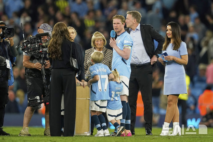 [맨체스터=AP/뉴시스] 맨체스터 시티(맨시티)의 케빈 더 브라위너가 20일(현지 시간) 영국 맨체스터 에티하드 스타디움에서 열린 2024-25 프리미어리그 37라운드 AFC 본머스와의 경기를 마친 후 가족과 함께 팬들에게 인사하고 있다. 2015년부터 맨시티에서 뛴 더 브라위너는 올여름 계약이 만료되면서 이날 마지막 홈경기를 뛰었다. 맨시티는 3-1로 승리하며 리그 3위로 도약했다. 2025.05.21.
