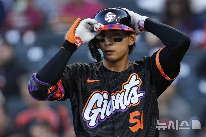 [샌프란시스코=AP/뉴시스] 샌프란시스코 자이언츠의 이정후가 20일(현지 시간) 미 캘리포니아주 샌프란시스코의 오라클 파크에서 열린 2025 메이저리그 캔자스시티 로열스와의 경기 1회 말 크게 헛스윙한 후 헬멧을 고쳐 쓰고 있다. 2025.05.21.