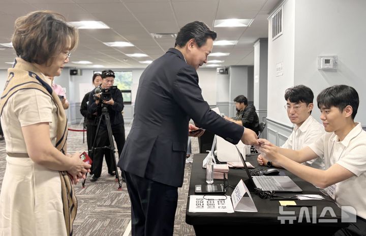 [워싱턴=뉴시스]이윤희 특파원 = 20일(현지 시간) 미국 버지니아주 알렉산드리아 코리안커뮤니티센터에 마련된 제21대 대통령선거 재외투표 투표소에서 조현동 주미대사가 신분 확인을 하고 있다. 이번 대선 재외선거는 이날부터 오는 25일까지 전 세계 118개국 223개 투표소에서 진행된다. 2025.05.21. [email protected]