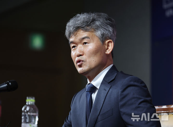 [서울=뉴시스] 김진아 기자 = 대한축구협회 제55대 집행부 김승희 전무이사가 21일 서울 종로구 축구회관에서 열린 기자간담회에서 취재진의 질문에 답하고 있다. 2025.05.21. [email protected]