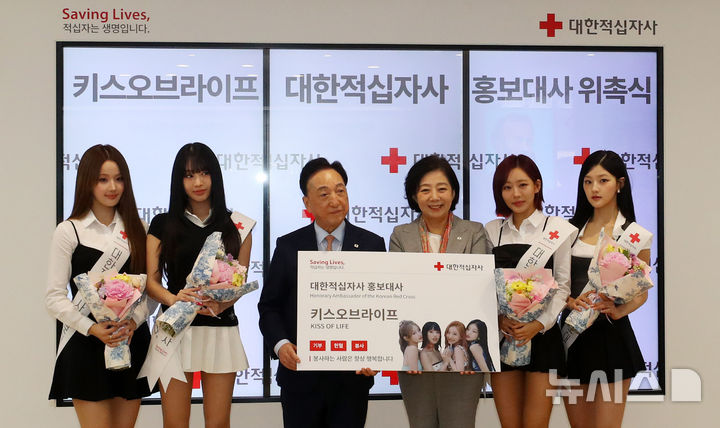[서울=뉴시스] 김혜진 기자 = 그룹 키스오브라이프가 21일 오전 서울 중구 대한적십자사 서울사무소에서 열린 홍보대사 위촉식에서 김철수(왼쪽 세번째) 대한적십자사 회장, 정채영(왼쪽 네번째) 부회장과 기념촬영을 하고 있다. 2025.05.21. [email protected]