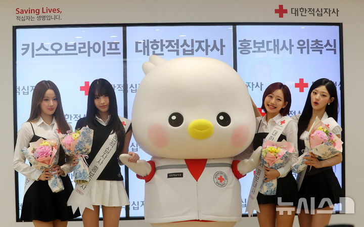 [서울=뉴시스] 김혜진 기자 = 그룹 키스오브라이프가 21일 오전 서울 중구 대한적십자사 서울사무소에서 열린 홍보대사 위촉식에서 대한적십자사 마스코트 인형과 기념촬영을 하고 있다. 2025.05.21. [email protected]