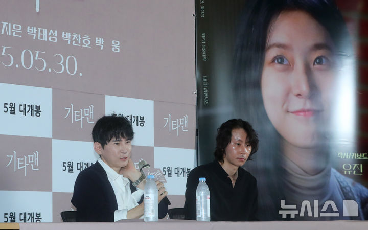 [서울=뉴시스] 김혜진 기자 = 배우 겸 감독 이선정(왼쪽), 김종면 감독이 21일 오후 서울 송파구 롯데시네마 월드타워에서 열린 영화 '기타맨' 언론시사회에서 취재진의 질문에 답하고 있다.