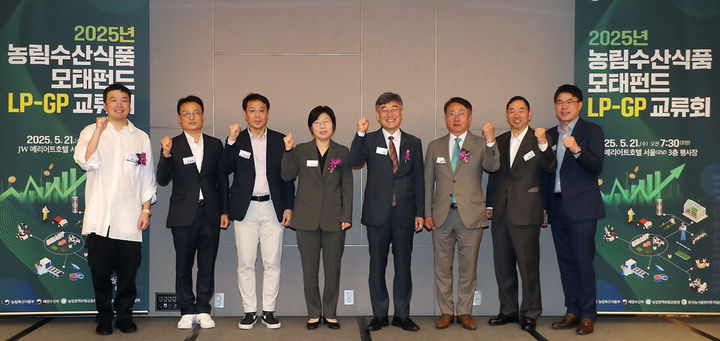 [세종=뉴시스] 강종민 기자 = 박수진 농림축산식품부 기획조정실장이 21일 서울 서초 JW메리어트호텔에서 열린 '농림수산식품모태펀드 투자자(LP)-운용사(GP) 조찬 교류회'에서 참석자들과 기념촬영을 하고 있다.