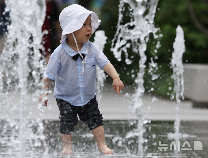 [서울=뉴시스] 조수정 기자 = 여름으로 들어서는 절기 '소만(小滿)'인 21일 서울 종로구 광화문광장에서 한 어린이가 분수대 물놀이를 즐기고 있다. 2025.05.21. [email protected]