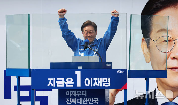 [인천=뉴시스] 조성우 기자 = 이재명 더불어민주당 대선후보가 21일 인천 부평구 부평역 북광장에서 열린 집중유세에서 시민들을 향해 인사하고 있다. 2025.05.21. [email protected]