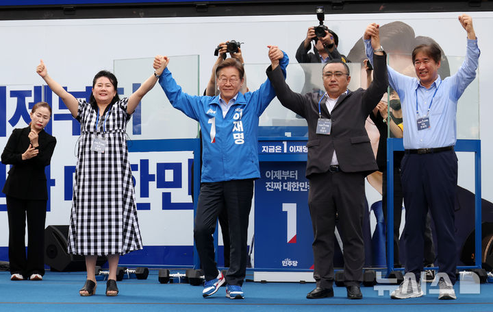 [인천=뉴시스] 조성우 기자 = 이재명 더불어민주당 대선후보가 21일 인천 서구 청라커낼로 인근에서 열린 유세에서 방현석(오른쪽) 작가 등 찬조연설자들과 손을 잡고 시민들을 향해 인사하고 있다. 2025.05.21. [email protected]