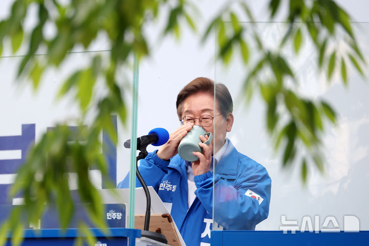 [인천=뉴시스] 조성우 기자 = 이재명 더불어민주당 대선후보가 21일 인천 서구 청라커낼로 인근에서 열린 유세에서 연설 도중 물을 마시고 있다. 2025.05.21. [email protected]