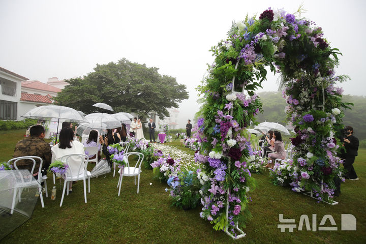 [제주=뉴시스] 우장호 기자 = 21일 오후 제주시 조천읍 에코랜드 호텔 정원에서 중국인 남여 한쌍이 야외 결혼식을 치르고 있다.
