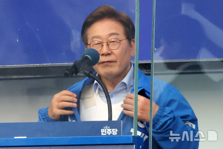 [인천=뉴시스] 조성우 기자 = 이재명 더불어민주당 대선 후보가 21일 인천 계양구 계양역 앞에서 열린 유세에서 선거운동복 지퍼를 내려 방탄복을 보여주고 있다. 2025.05.21. [email protected]