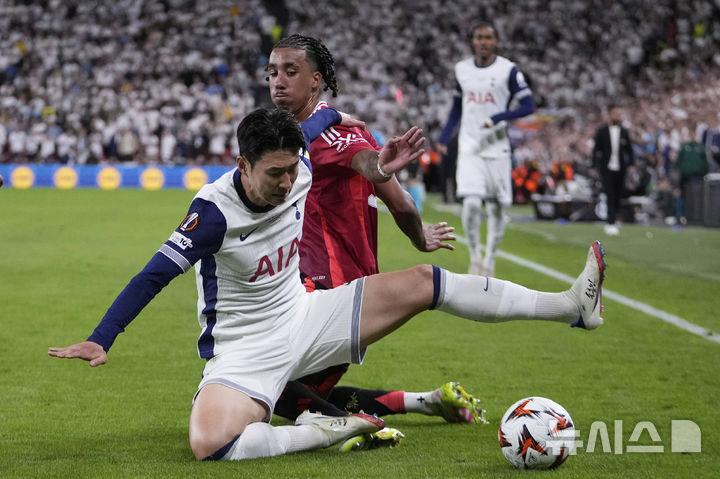 [빌바오=AP/뉴시스] 토트넘 홋스퍼의 손흥민이 21일(현지 시간) 스페인 빌바오의 산 마메스 스타디움에서 열린 2024-25 유럽축구연맹(UEFA) 유로파리그(UEL) 결승전 맨체스터 유나이티드와의 경기 중 공을 다투고 있다. 손흥민은 팀이 1-0으로 앞선 후반 22분 교체 투입돼 경기를 승리로 마무리하며 생애 첫 우승컵을 들어 올렸다. 2025.05.22.