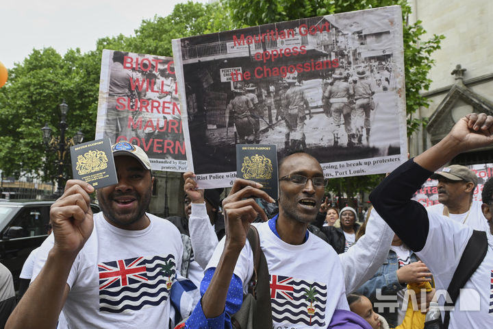 [런던=AP/뉴시스]차고스 제도 주권을 모리셔스에 이양하는 것에 반대하는 사람들이 22일 런던의 고등법원 앞에서 시위를 벌이고 있다. 영국 법원이 22일 협정 체결을 불과 몇시간 남기고 영국이 차고스 제도에 대한 주권을 모리셔스로 이양하는 것을 가로막았다. 2025.05.22.