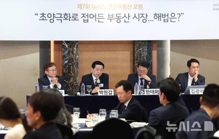 [서울=뉴시스] 조수정 기자 = 박원갑 KB국민은행 부동산수석전문위원이 22일 오전 서울 중구 롯데호텔서울에서 열린 제7회 뉴시스 건설부동산포럼 '초양극화로 접어든 부동산 시장…해법은?'에서 '부동산 양극화 해소를 위한 제언' 종합토론에서 발언하고 있다. 왼쪽부터 이종규 국가미래연구원 연구위원, 박원갑 KB국민은행 부동산수석전문위원, 한태화 법무법인 B&H 대표변호사, 김광석 한국경제산업연구원 경제연구실장. 2025.05.22. [email protected]