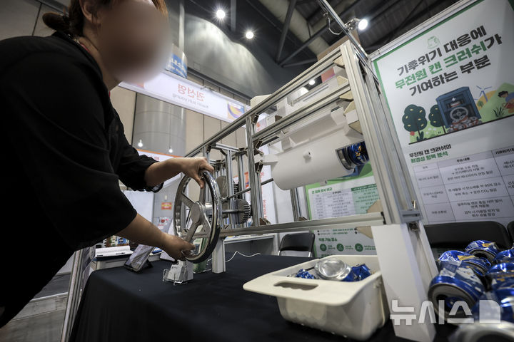 [고양=뉴시스] 정병혁 기자 = 22일 경기 고양시 킨텍스에서 열린 2025 여성발명왕 엑스포에서 참가자가 무전원 캔크러쉬를 시연하고 있다. 2025.05.22. [email protected]