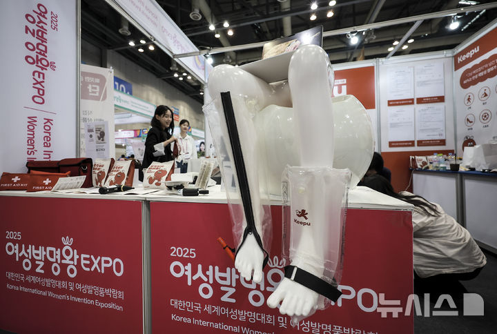 [고양=뉴시스] 정병혁 기자 = 22일 경기 고양시 킨텍스에서 열린 2025 여성발명왕 엑스포에서 한 참관객이 휴대용 염좌 신속 솔루션이 전시되어 있다. 2025.05.22. [email protected]