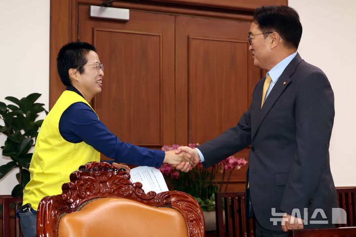 [서울=뉴시스] 조성봉 기자= 우원식 국회의장이 22일 오후 서울 여의도 국회의장 집무실에서 '홈플러스 정상화 방안'과 관련해 면담하러 온 안수용(왼쪽) 마트산업노조 홈플러스지부장과 악수하고 있다. 2025.05.22. [email protected]
