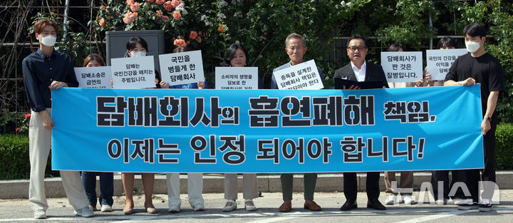 [서울=뉴시스] 김금보 기자 = 한국금연운동협의회와 한국YMCA연합회 회원들이 22일 오후 서울 서초구 서울고등법원 앞에서 국민건강보험공단의 담배회사 상대 손해배상청구 소송을 지지하는 기자회견을 하고 있다. 2025.05.22. [email protected]