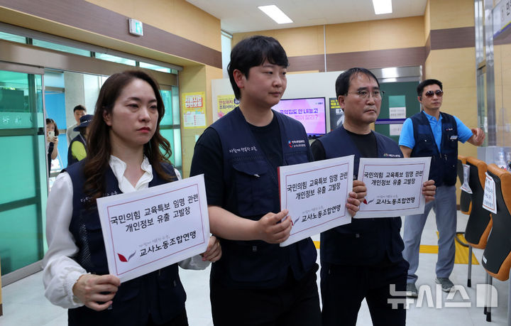 [서울=뉴시스] 김혜진 기자 = 교사노조연맹이 22일 오후 서울 종로구 서울경찰청 앞에서 국민의힘 대선캠프 교사 개인정보 대규모 유출 관련 긴급 기자회견을 마치고 고발장을 제출하고 있다. 2025.05.22. [email protected]