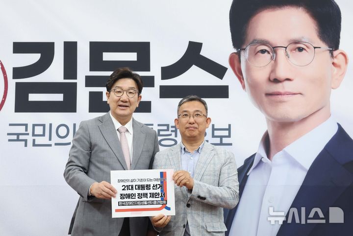 [서울=뉴시스] 조성봉 기자= 권성동 국민의힘 원내대표가 22일 오후 서울 여의도 국회에서 열린 장애인 단체 제21대 대선 정책 제안서 전달식에서 김용주(오른쪽) 한국장애인자립생활센터총연합회 공동대표와 기념촬영을 하고 있다.2025.05.22. [email protected]
