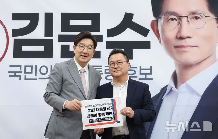 [서울=뉴시스] 조성봉 기자= 권성동 국민의힘 원내대표가 22일 오후 서울 여의도 국회에서 열린 장애인 단체 제21대 대선 정책 제안서 전달식에서 조성민(오른쪽) 한국장애인재활협회 사무총장과 기념촬영을 하고 있다.2025.05.22. [email protected]