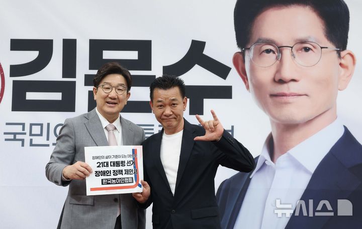 [서울=뉴시스] 조성봉 기자= 권성동 국민의힘 원내대표가 22일 오후 서울 여의도 국회에서 열린 장애인 단체 제21대 대선 정책 제안서 전달식에서 정희찬(오른쪽) 한국농아인협회 상임이사와 기념촬영을 하고 있다.2025.05.22. [email protected]