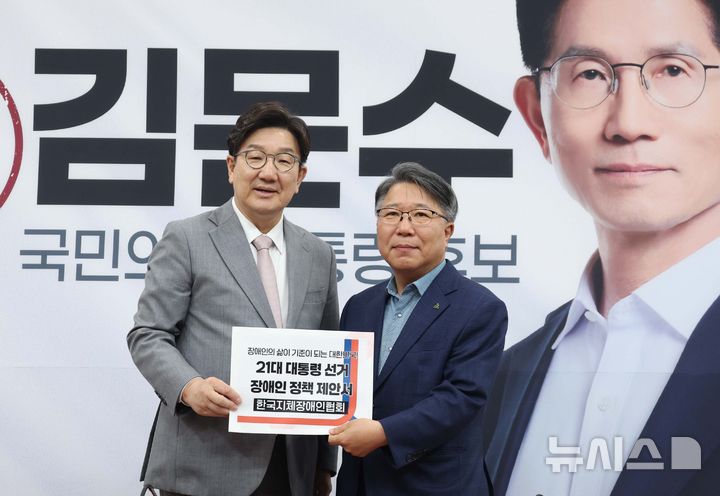 [서울=뉴시스] 조성봉 기자= 권성동 국민의힘 원내대표가 22일 오후 서울 여의도 국회에서 열린 장애인 단체 제21대 대선 정책 제안서 전달식에서 홍현근(오른쪽) 한국지체장애인협회 사무총장과 기념촬영을 하고 있다.2025.05.22. [email protected]