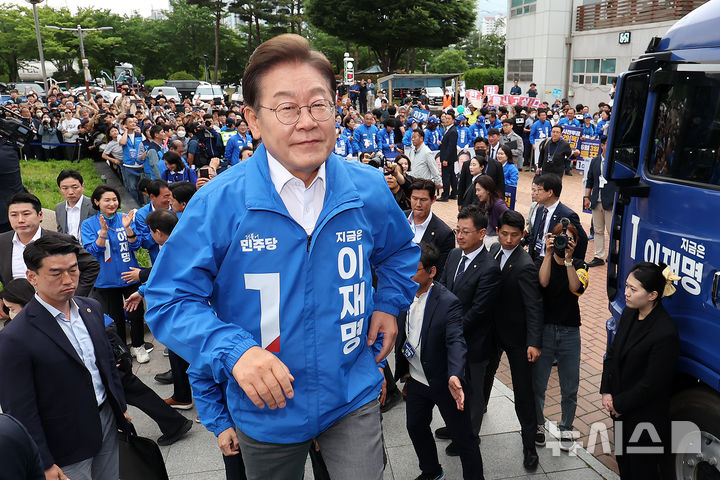 [양산=뉴시스] 조성우 기자 = 이재명 더불어민주당 대선후보가 22일 경남 양산시 양산워터파크공원에서 열린 집중유세에 도착해 연단에 오르고 있다. 2025.05.22. [email protected]