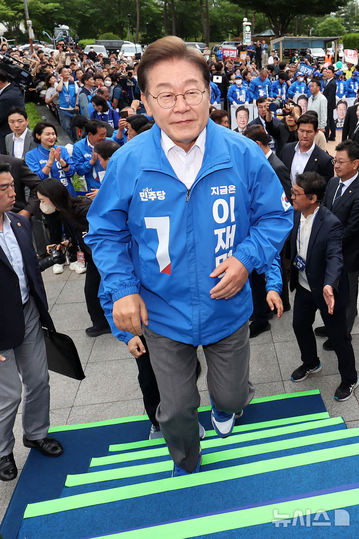 [양산=뉴시스] 조성우 기자 = 이재명 더불어민주당 대선후보가 22일 경남 양산시 양산워터파크공원에서 열린 집중유세에 도착해 연단에 오르고 있다. 2025.05.22. [email protected]