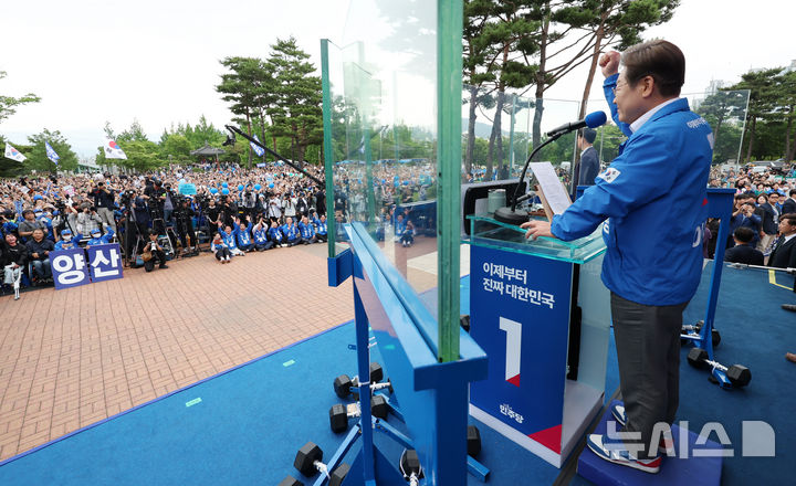 [양산=뉴시스] 조성우 기자 = 이재명 더불어민주당 대선후보가 22일 경남 양산시 양산워터파크공원에서 열린 집중유세에서 지지를 호소하고 있다. 2025.05.22. [email protected]