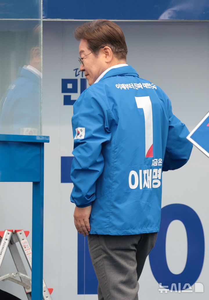 [양산=뉴시스] 조성우 기자 = 이재명 더불어민주당 대선후보가 22일 경남 양산시 양산워터파크공원에서 열린 집중유세에서 연설을 하기 위해 방탄 유리막이 설치된 발언대로 향하고 있다. (공동취재) 2025.05.22. [email protected]