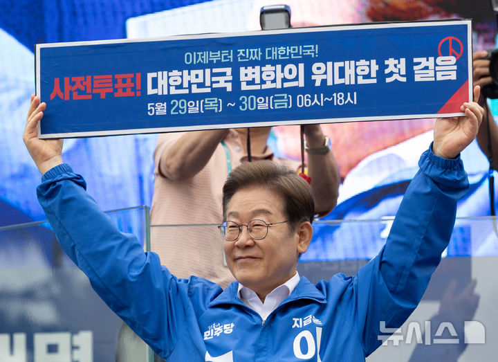 [양산=뉴시스] 조성우 기자 = 이재명 더불어민주당 대선후보가 22일 경남 양산시 양산워터파크공원에서 열린 집중유세에서 손팻말을 들고 사전투표 독려 퍼포먼스를 하고 있다. (공동취재) 2025.05.22. [email protected]