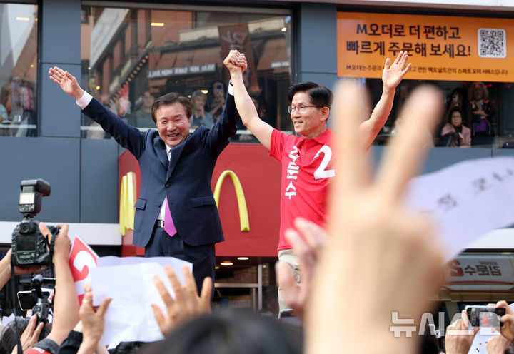 [광명=뉴시스] 고승민 기자 = 김문수 국민의힘 대선 후보와 손학규 전 경기지사가 22일 경기 광명시 철산로데오거리에서 유세를 하고 있다. 2025.05.22. [email protected]