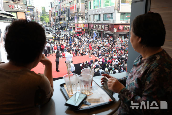 [광명=뉴시스] 고승민 기자 = 김문수 국민의힘 대선 후보가 22일 경기 광명시 철산로데오거리에서 유세를 하고 있다. 이를 근처 카페의 시민들이 지켜보고 있다. 2025.05.22. [email protected]
