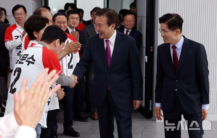 [서울=뉴시스] 조성봉 기자 = 김문수 국민의힘 대선후보 지지를 선언한 손학규 전 바른미래당 대표가 22일 오전 서울 여의도 국민의힘 중앙당사에서 안철수 공동선대위원장을 비롯한 참석자들과 인사를 하고 있다.  2025.05.22. [email protected]