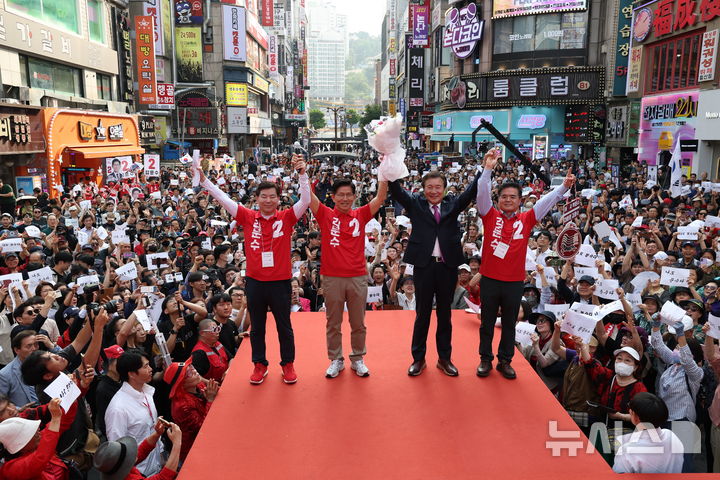 [광명=뉴시스] 고승민 기자 = 김문수 국민의힘 대선 후보와 손학규 전 경기지사가 22일 경기 광명시 철산로데오거리에서 유세를 하고 있다. (공동취재) 2025.05.22. [email protected]