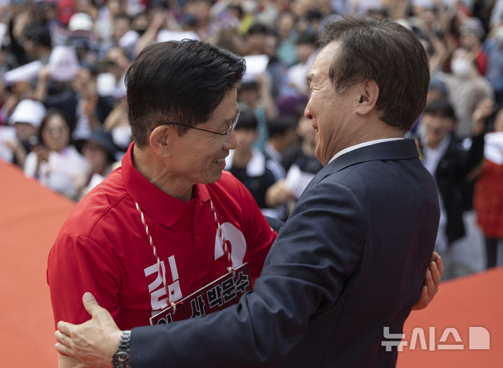 [광명=뉴시스] 고승민 기자 = 김문수 국민의힘 대선 후보와 손학규 전 경기지사가 22일 경기 광명시 철산로데오거리에서 유세를 하기 전 포옹을 하고 있다. (공동취재) 2025.05.22. [email protected]
