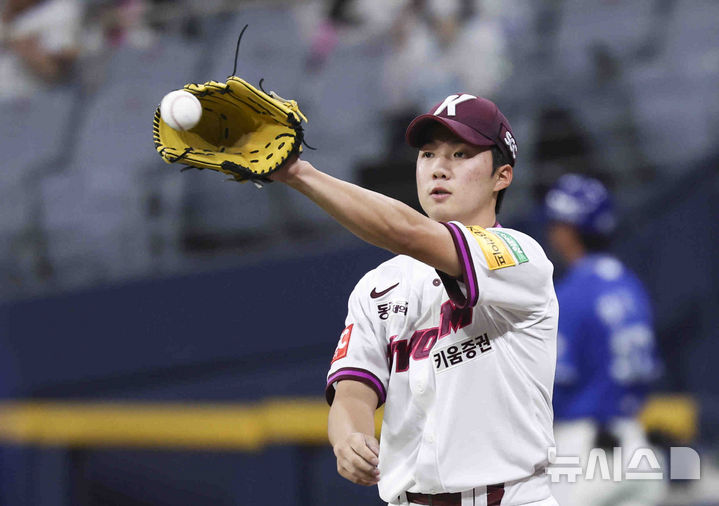 [서울=뉴시스] 김근수 기자 = 22일 서울 구로구 고척스카이돔에서 열린 2025 KBO리그 삼성 라이온즈와 키움 히어로즈의 경기, 5회초 키움 선발 김연주가 무실점으로 이닝을 종료하고 공을 잡고 있다. 2025.05.22. [email protected]