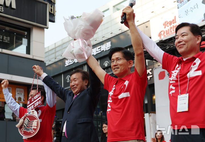 [광명=뉴시스] 고승민 기자 = 김문수 국민의힘 대선 후보와 손학규 전 경기지사가 22일 경기 광명시 철산로데오거리에서 유세를 하고 있다. 2025.05.22. [email protected]
