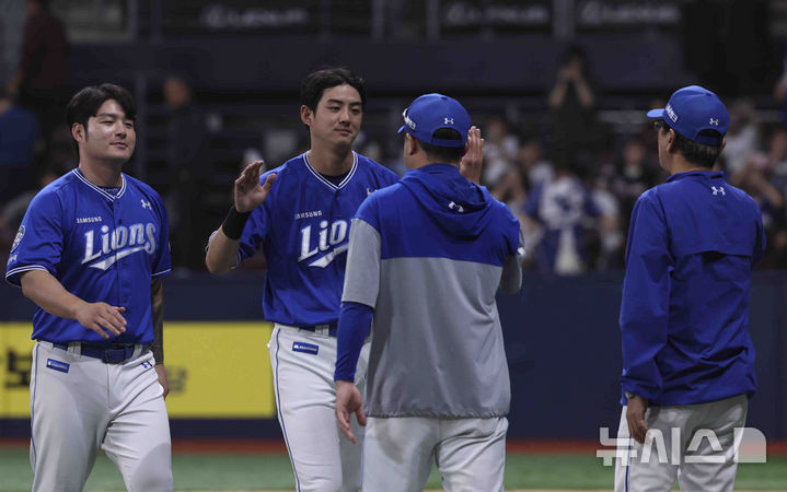 [서울=뉴시스] 김근수 기자 = 22일 서울 구로구 고척스카이돔에서 열린 2025 KBO리그 삼성 라이온즈와 키움 히어로즈의 경기에서 삼성 라이온즈가 키움 히어로즈를 상대로 2-0 승리를 거두고 구자욱과 선수들이 기뻐하고 있다. 2025.05.22. [email protected]