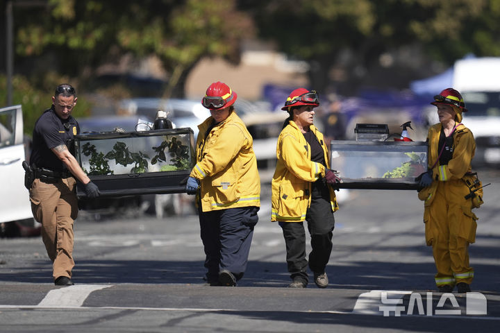 [샌디에이고=AP/뉴시스] 22일(현지 시간) 미 캘리포니아주 샌디에이고의 한 주택가에 경비행기 한 대가 추락해 화재 등 피해가 발생한 가운데, 샌디에이고 동물보호협회 직원들이 피해 주택에서 애완 도마뱀을 대피시키고 있다. 이 사고로 비행기 탑승자 6명 중 3명이 숨지고 지역 주민 100여 명이 대피했다. 2025.05.23.