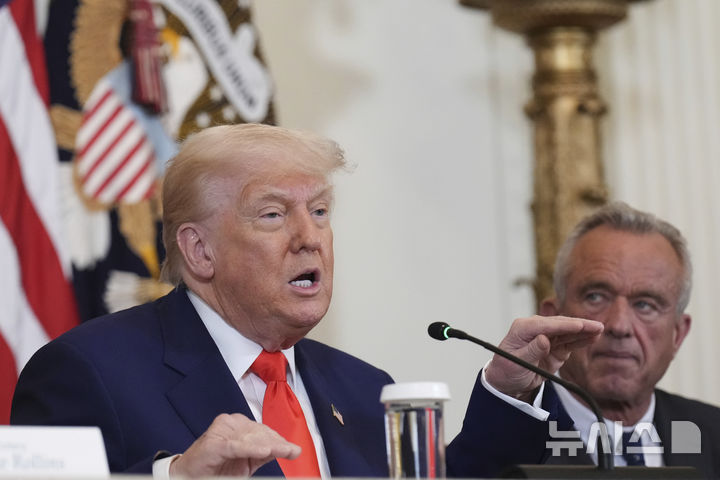 [워싱턴=AP/뉴시스] 도널드 트럼프 미국 대통령이 22일(현지 시간) 백악관 이스트룸에서 열린 '미국을 다시 건강하게'(Make America Healthy Again·MAHA)' 위원회 행사에서 로버트 F. 케네디 주니어 보건복지부 장관이 배석한 가운데 발언하고 있다. 트럼프 대통령은 "아이들에게 처방되는 약물부터 학교 급식 메뉴까지, 미국의 생활 방식이 비만, 우울증, 주의력 결핍 장애(ADD) 등 소아 질환에 어떤 영향을 미치는지를 100일 내에 검토·분석하겠다"라고 밝혔다. 2025.05.23.