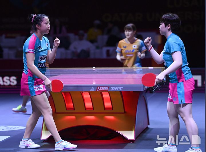 [도하(카타르)=뉴시스] 사진공동취재단 = 신유빈, 유한나가 22일(현지 시간) 카타르 도하 루사일 아레나에서 열린 2025 국제탁구연맹(ITTF) 세계선수권대회 여자복식 8강 일본 오도 사츠키, 요코이 사쿠라와 경기에서 득점 후 주먹을 쥐고 있다. 2025.05.23. [email protected]