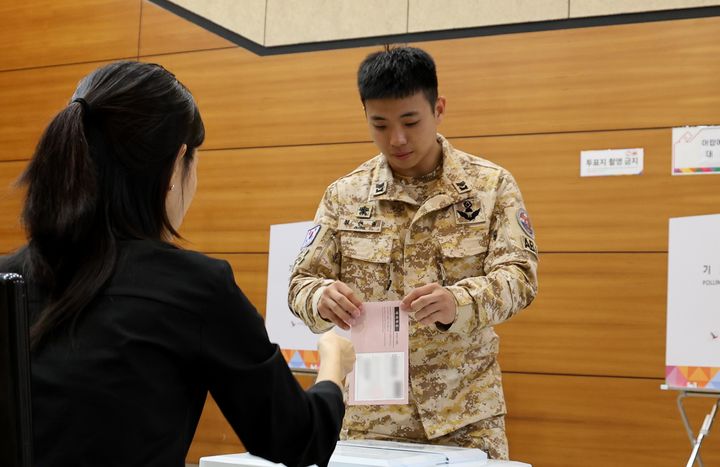 [서울=뉴시스] 아랍에미리트(UAE)에 파병중인 아크부대가 지난 20일부터 21일까지(현지 시간) 주UAE 대한민국 대사관에 마련된 제21대 대통령선거 재외투표소에서 투표하고 있다. (사진=합참 제공) 2025.05.23. [email protected]