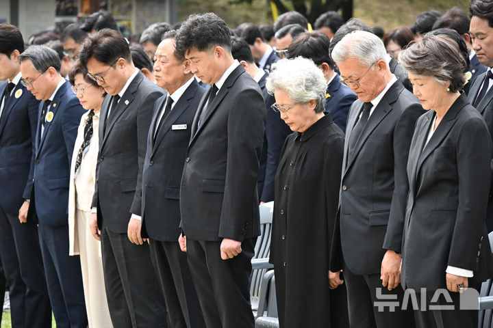 [김해=뉴시스] 차용현 기자 = 23일 오후 경남 김해지 진영읍 봉하마을에서 열린 고 노무현 전 대통령 서거 16주기 추도식에서 문재인 전 대통령을 비롯한 참석자들이 묵념을 하고 있다. 2025.05.23.(공동취재) [email protected]