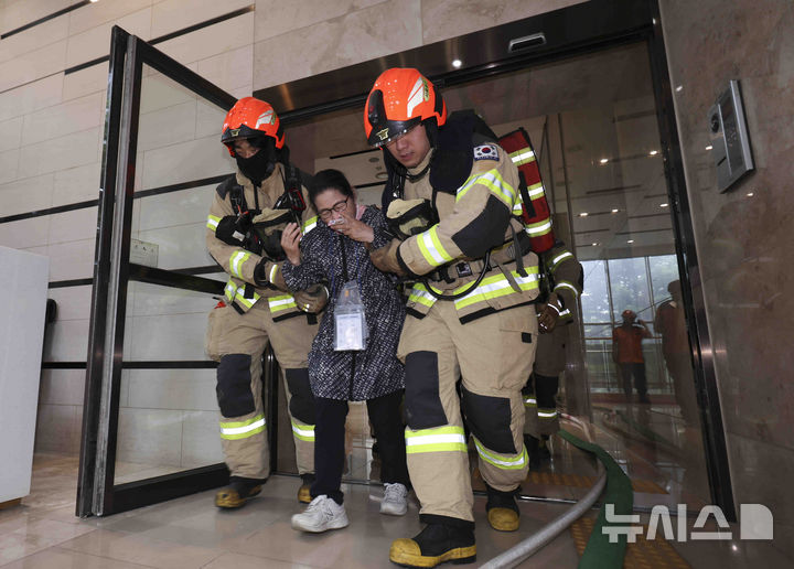 [서울=뉴시스] 김근수 기자 = 23일 서울 용산구 래미안 첼리투스에서 진행된 고층빌딩 재난대응 안전한국훈련에서 소방대원들이 화재상황을 가장한 훈련을 하고 있다. 2025.05.23. [email protected]