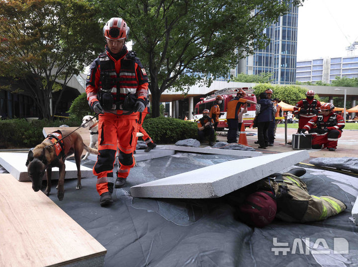 [서울=뉴시스] 김근수 기자 = 23일 서울 용산구 래미안 첼리투스에서 진행된 고층빌딩 재난대응 안전한국훈련에서 소방대원들이 건물붕괴 상황에 가장한 훈련을 하고 있다. 2025.05.23. [email protected]